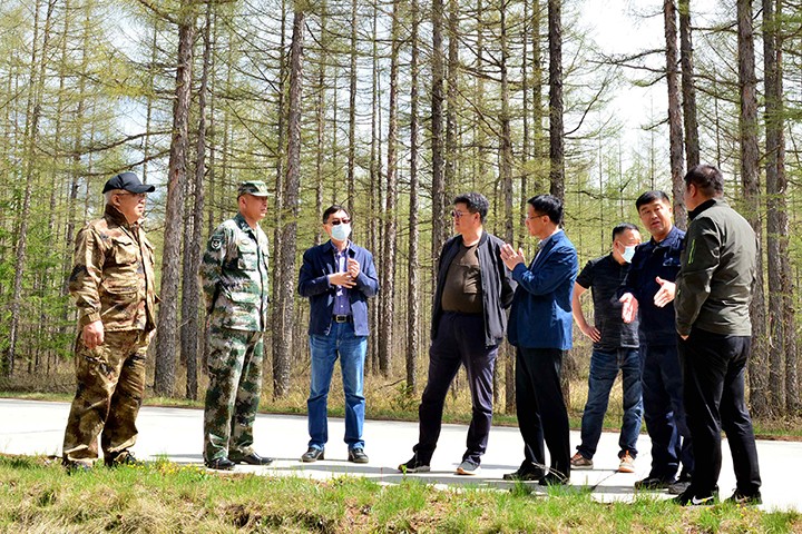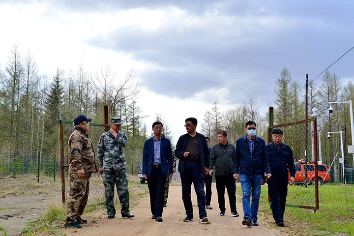 5月28日在白河林区,张辉一行对中朝边境地区森林防火工作进行了检查,并看望了靠前驻防的森林消防特勤大队队员。