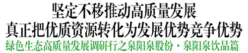 在泉阳泉股份有限公司的调研座谈会上,调研组详细了解企业的发展历程和当前运营状况,对其取得的成绩给予高度肯定。调研组指出,省委、省政府领导对矿泉水产业的发展高度重视,泉阳泉要紧紧围绕高质量发展这一首要任务,进一步健全完善现代企业制度,采取切实有效的措施,增强产品竞争创效能力,提升产品质量和档次,扩大市场占有率,推动矿泉水产业实现高质量发展。要迅速适应国际、国内新的市场形势,坚持走“高端化、功能化、差异化”发展路径,持续放大泉阳泉优质天然矿泉水稀缺资源优势,努力打造新的经济增长点。要加强上市公司市值管理,抓住新一轮国企改革的重大机遇,激发企业的内生动力,为企业的持续健康发展创造良好的外部环境。